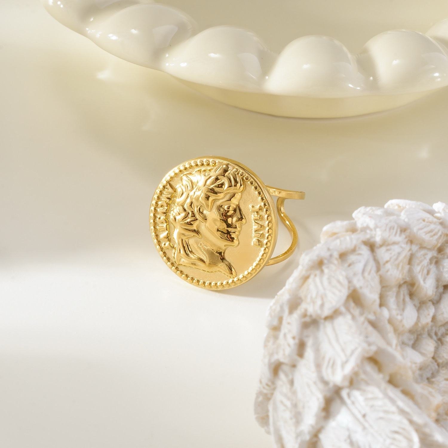 Geef je look een unieke touch met deze stijlvolle munten ring. Het opvallende muntdetail geeft de ring een vintage uitstraling, terwijl het minimalistische ontwerp hem veelzijdig maakt voor dagelijks gebruik of bijzondere gelegenheden.