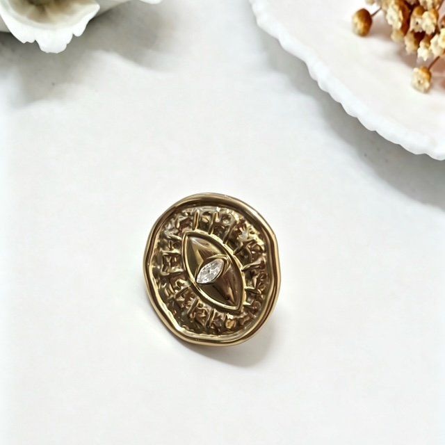 Deze opvallende statement ring trekt meteen alle aandacht. Het grote oog, subtiel afgewerkt met een diamantje, geeft een mysterieus en stijlvol accent aan je look. Perfect om solo te dragen voor maximale impact of te mixen met andere ringen voor een creatieve, gelaagde stijl.