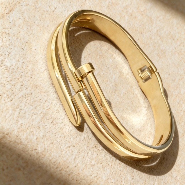 Geef je look een stoere en moderne twist met deze unieke armband met spijkerontwerp. Geïnspireerd op de kracht en eenvoud van industriële vormen, straalt dit sieraad een perfecte balans uit tussen edgy en elegant